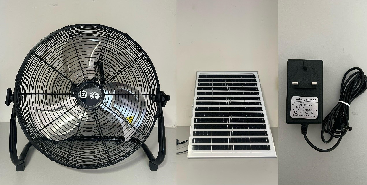 1 Fan with Built-in Battery, 1 Solar Panel with Cable, 1 Three-Prong Plug and Power Cable