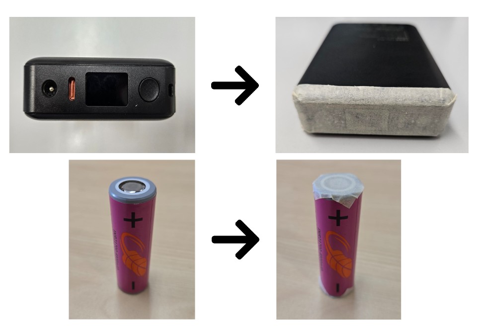 - 在移动电源/充电池的金属端子上贴上胶纸,防止在储存及运送中意外触碰金属端子,造成危险。